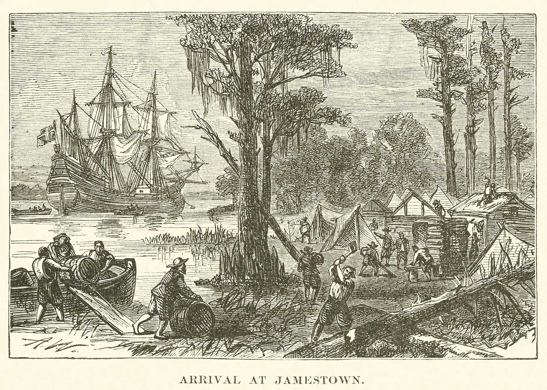 Reverent words they were, yet such words would not come easily. Far from a paradise, these colonists had landed in a mosquito-ridden swamp, surrounded by 14,000 fearsome Algonquian Indians led by the powerful Powhatan. By the next year, only 40 of the original 104 men had survived.