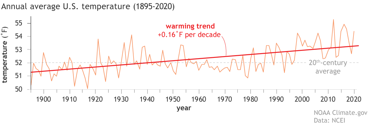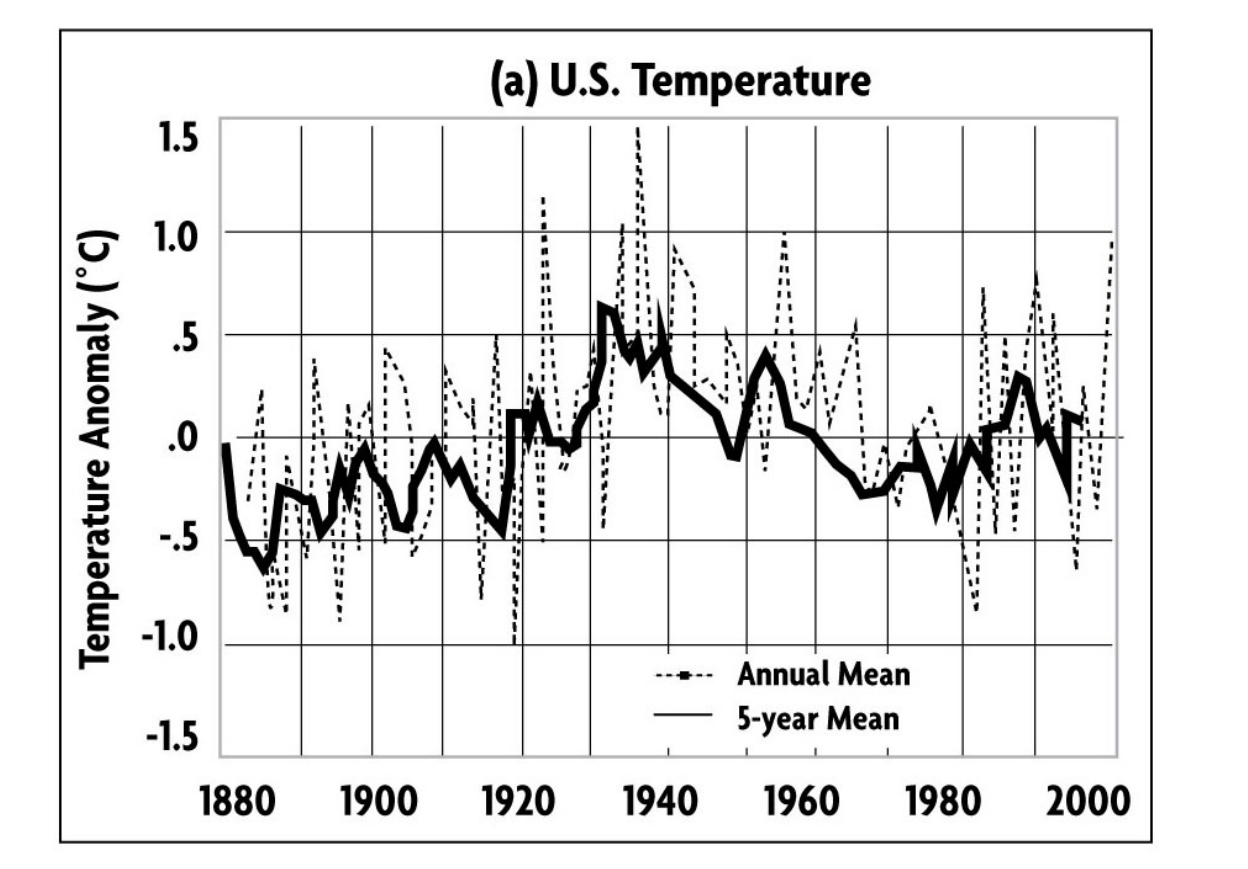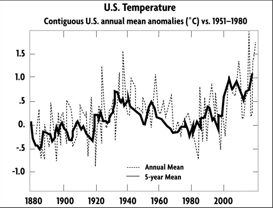 Well, this paints quite a stark contrast. Based on this graph, we see a general warming, a peak, and then a general cooling. From 1880 to 1934, the Earth was slightly warming, and from 1934 to 1998 the United States was cooling. The temperature does not parallel the rising rates of CO₂. Now lets look 2013.