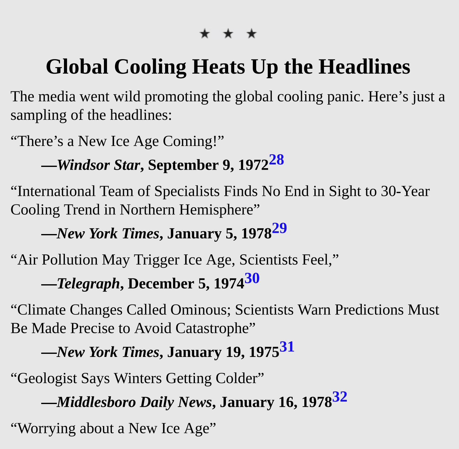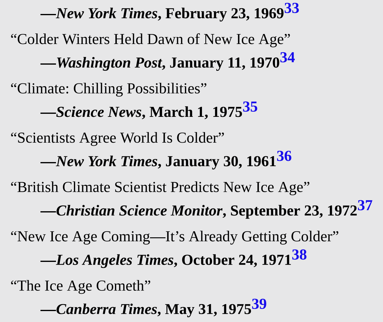 If you look up the 70's global cooling scare, you’ll get all the top results of it being climate denier propaganda and a fake hysteria, however here’s a list of primary source documents so you can make your own decisions. An important note is that the same scientists promoting a global freeze would become the standard bearers for the “deadly” man-made heating.